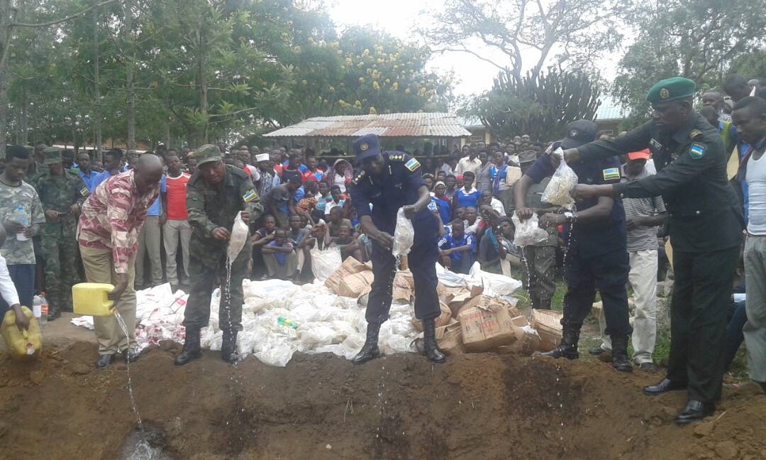 Present during the destruction exercise include the mayor of Nyagatare, George Mupenzi, the District Police Commander (DPC) Chief Supt. Johnson Sesonga and hundreds of residents, among others.