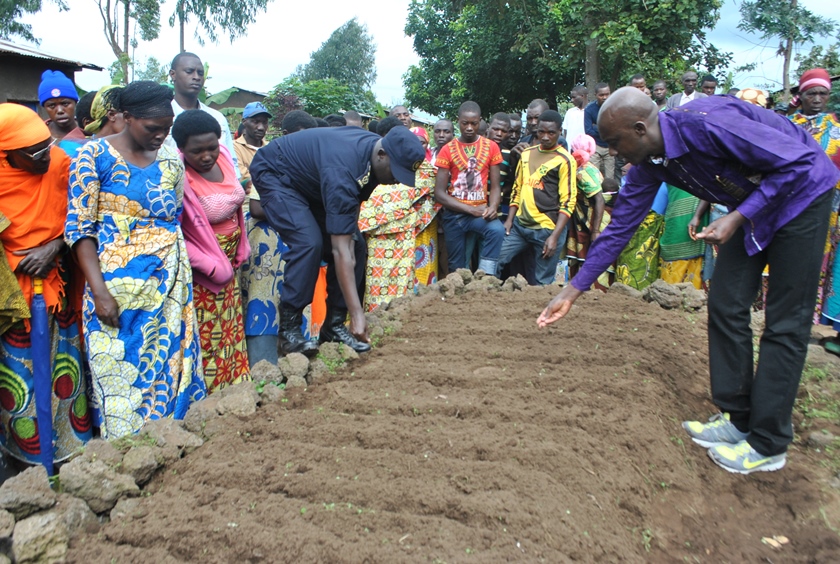 Minister Francis Kaboneka cultivating in one of the kitchen gardens - Akarima k'igikoni prepared in Musanze.