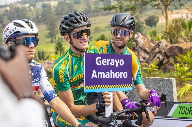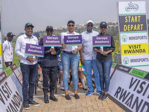 The Minister of Sports, Aurore Mimosa Munyagaju, Mayor of City of Kigali, Pudence Rubingisa, RNP spokesperson, Commissioner of Police (CP) John Bosco Kabera, FERWACY president, Abdallah Murenzi and Chief Tourism Officer at Rwanda Development Board (RDB) Michaella Rugwizangoga as well as riders came together to hold Gerayo Amahoro placards, prior to the start of the continental race, to send a message of responsive road usage.