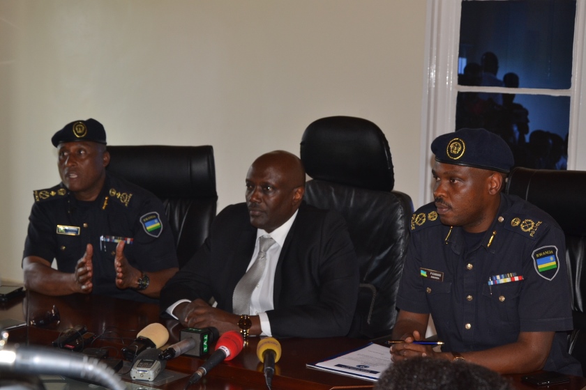 (L-R): CP Emmanuel Butera, Ugandan High Commissioner to Rwanda Richard Kabonero and ACP Peter Karake addressing the media during the handover event at RNP Headquarters.
