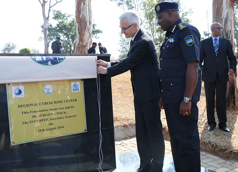 Interpol SG Jürgen Stock breaking the ground for the construction of the regional cybercrime centre, as IGP Emmanuel K. Gasana looks on.
