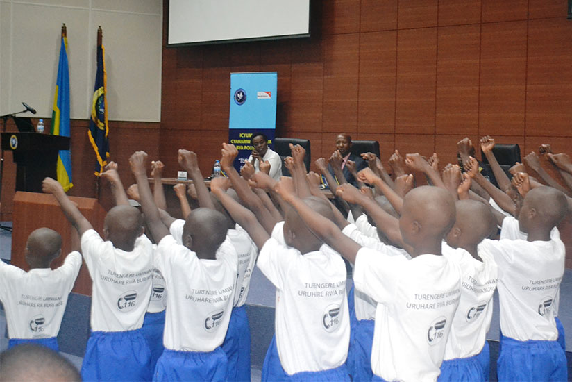 Children raising their hands to signal the fight and promotion of the rights of children on ‘Police Day’.
