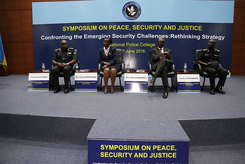 Ministers; Louis Mushikiwabo of Foreign Affairs and Johnston Busingye of Justice, and the commandant of NPC, CP Felix Namuhoranye during the symposium.