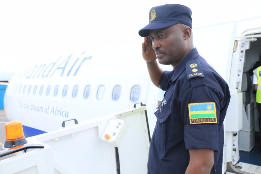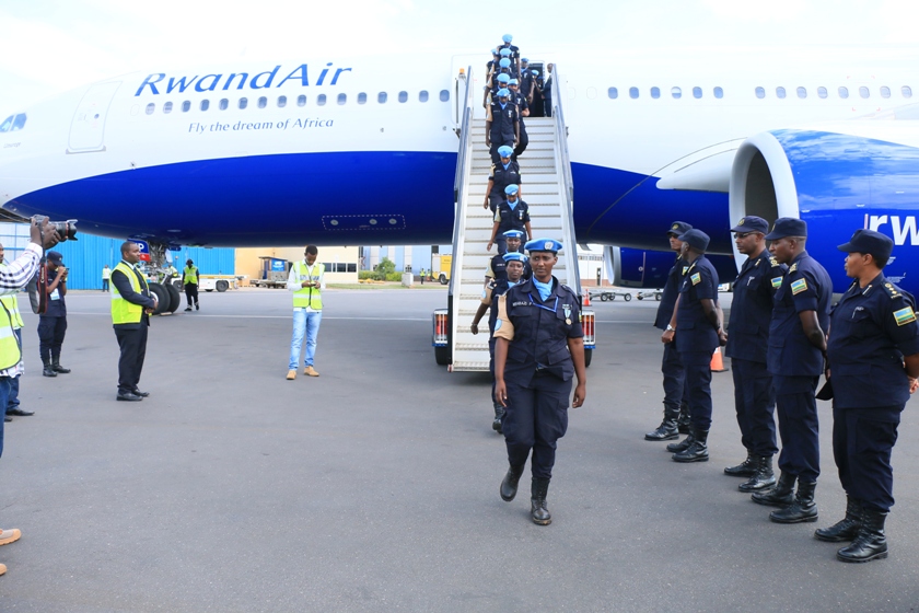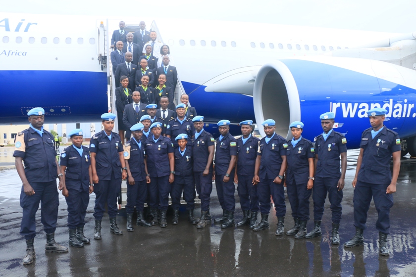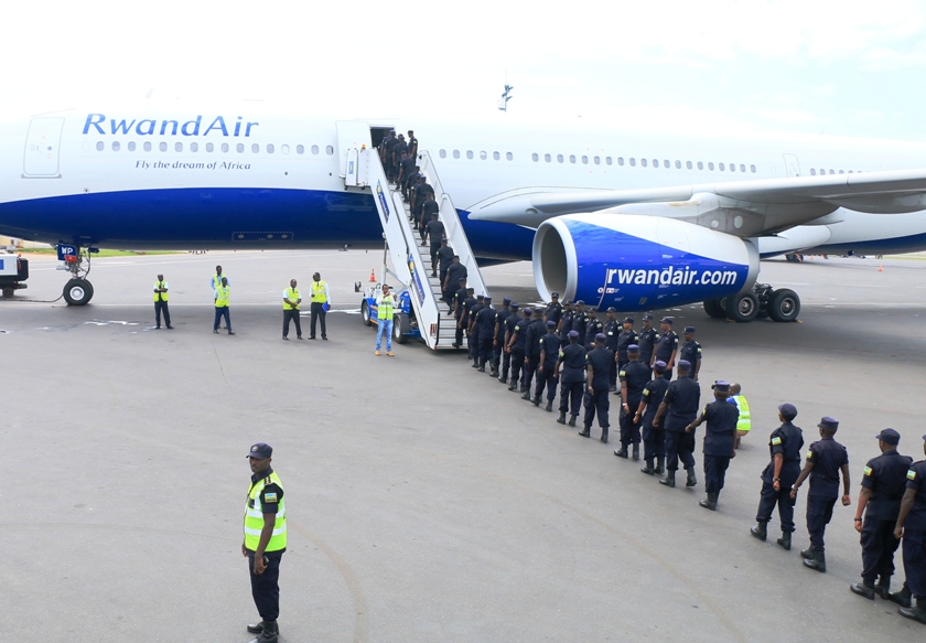 The deployed PSU contingent boards RwandAir for the tour-of-duty in CAR