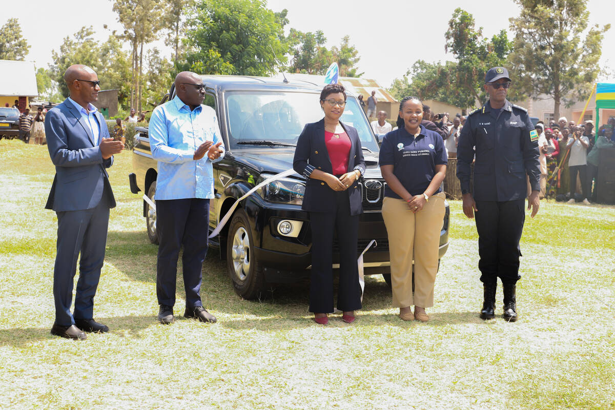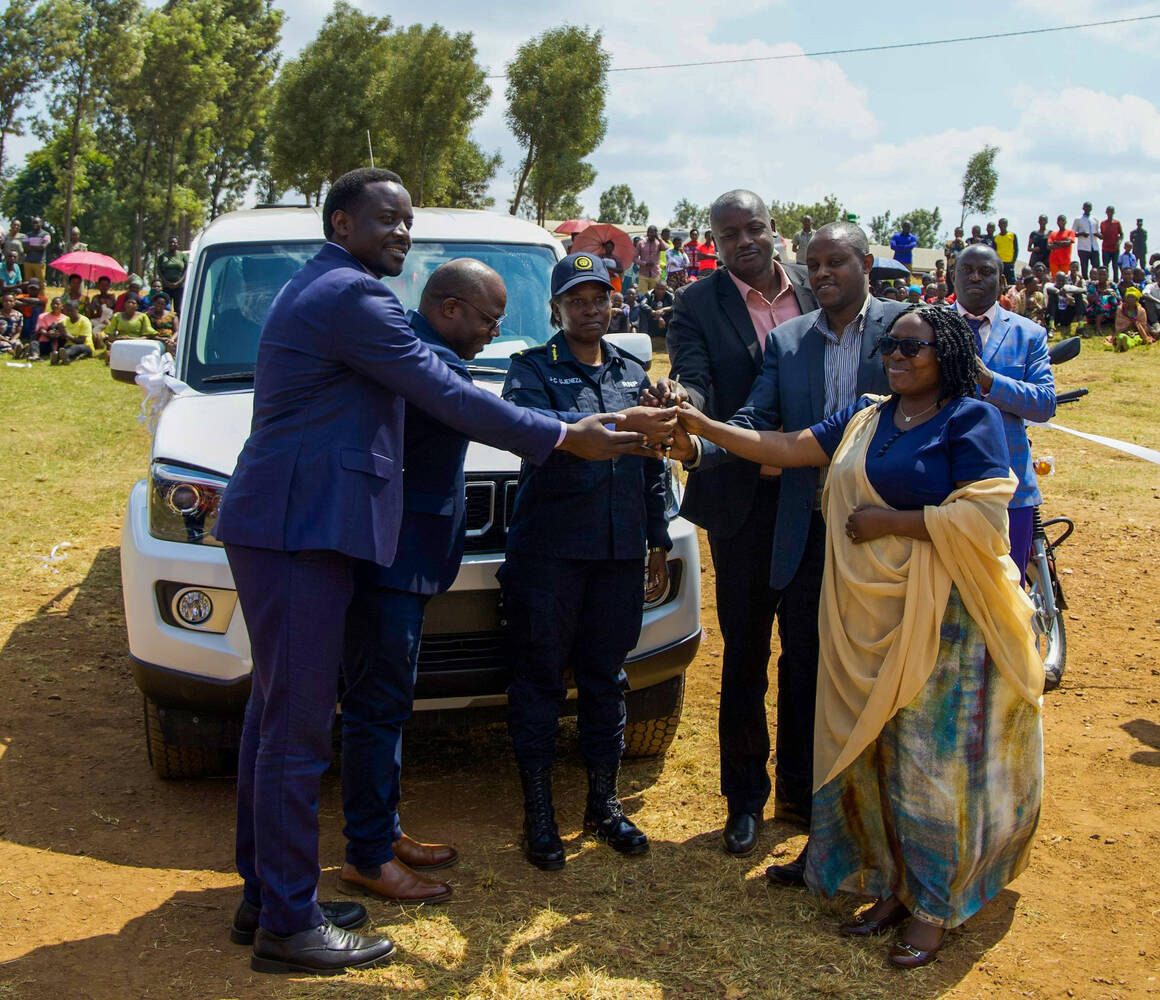 Minister Jeannette Bayisenge, Governor of the Eastern Province, CGP Emmanuel K. Gasana, Deputy IGP in charge of Operations, Vincent Sano in a group photo after handing over the vehicle to the executive secretary of Karangazi sector.