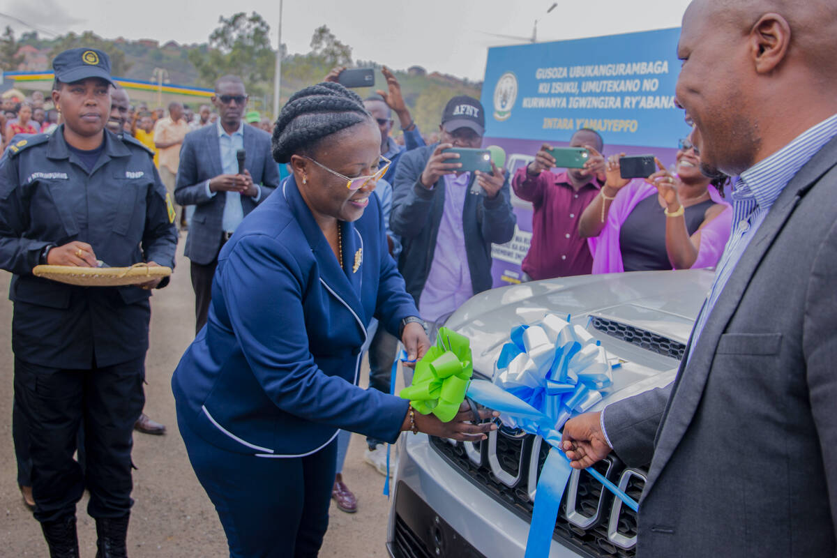 The Minister of Local Government, Jean Claude Musabyimana and the Deputy IGP in charge of Administration and Personnel, Jeanne Chantal Ujeneza handed over the vehicle to the executive secretary of Bukure sector in Gicumbi District.