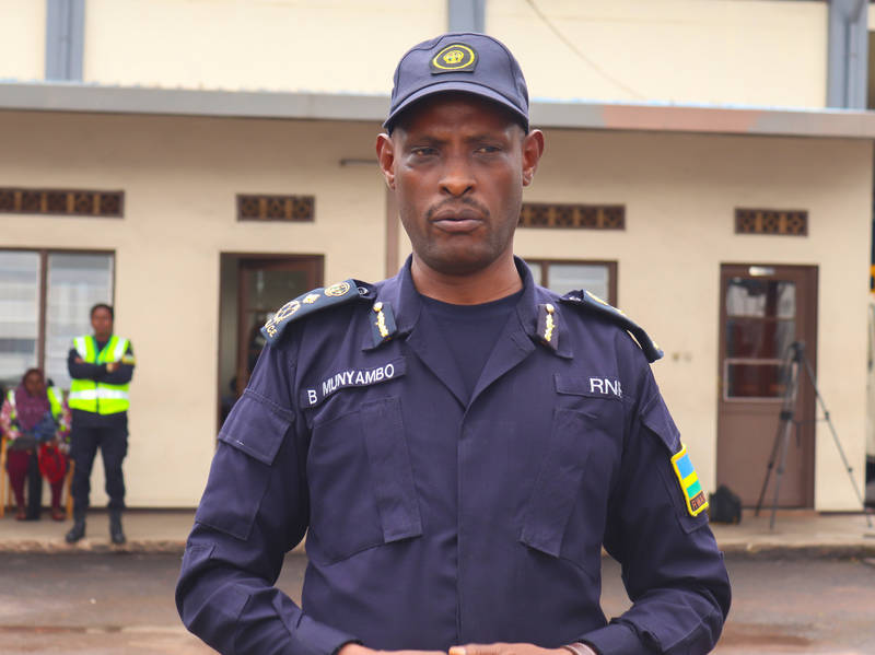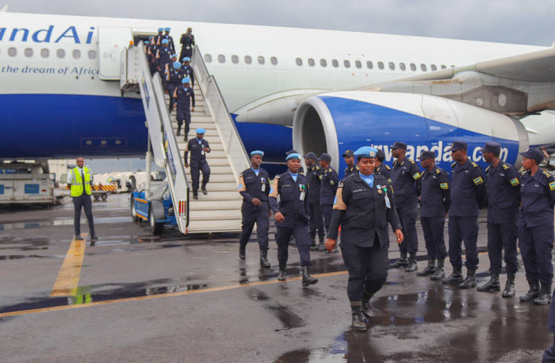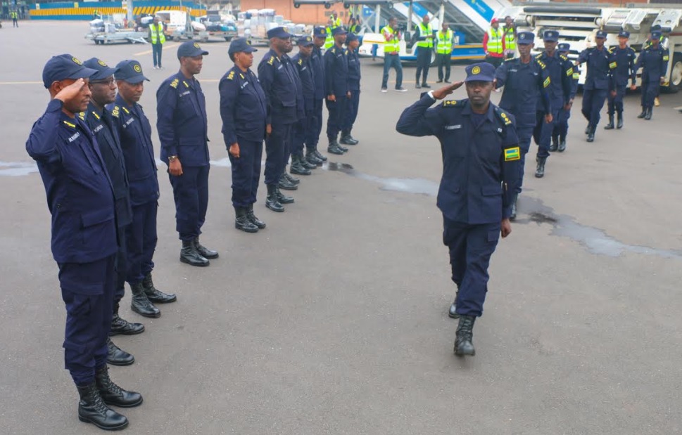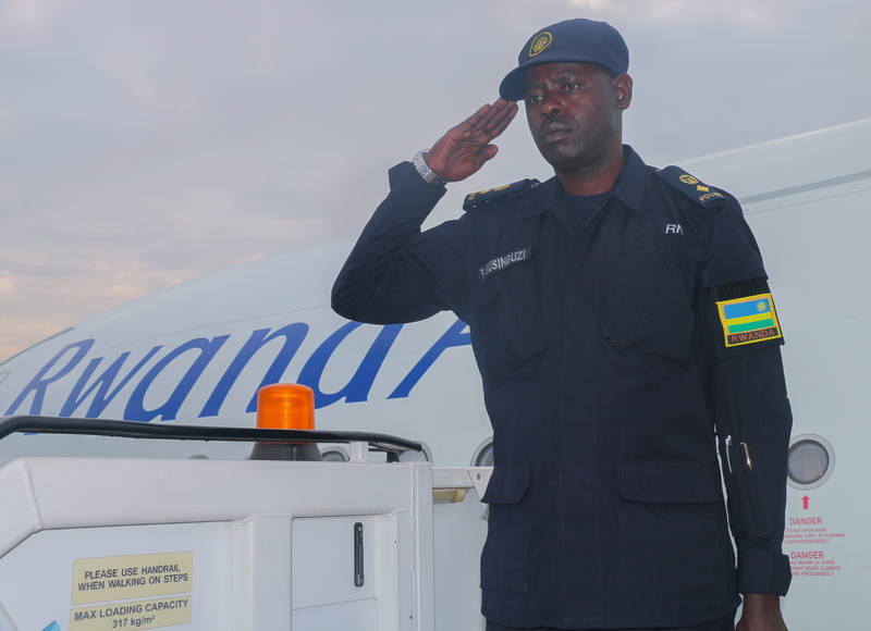 Commissioner of Police (CP) Bruce Munyambo saluted the rotated contingents at Kigali International Airport.