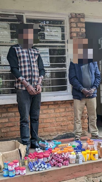 Anaclet Muhire, 28, and Fulgence Hakizayezu, 38, were intercepted in Mahoro Village, Rwimiyaga Cell of Rwimiyaga Sector with quantities of assorted skin bleaching oils and creams.