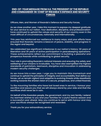 END OF YEAR MESSAGE BY H.E, THE PRESIDENT OF THE REPUBLIC AND COMMANDER IN CHIEF OF RWANDA’S DEFENCE AND SECURITY FORCES