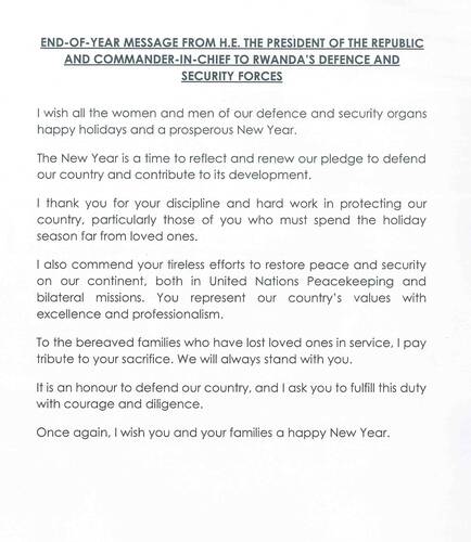 END OF YEAR MESSAGE FROM H.E. THE PRESIDENT OF THE REPUBLIC AND COMMANDER -IN - CHIEF TO RWANDA'S DEFENCE AND SECURITY FORCES