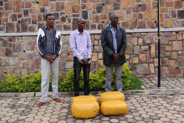 Polisi yerekanye abagabo batatu yafatanye udupfunyika 8000 tw’urumogi