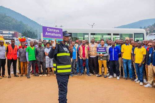 Ni mu bukangurambaga bw'Umutekano wo mu muhanda buzwi ku izina rya "Gerayo Amahoro" bwabereye mu kigo abagenzi bategeramo imodoka (Gare) ya Nyabugogo, mu Karere ka Nyarugenge mu rwego rwo kubashishikariza gukumira impanuka zihitana ubuzima bw'abazifashisha mu ngendo zigirira hirya no hino mu gihugu.