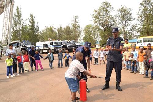 Madamu Dinah Asaba wari uyoboye iri tsinda ry’abanyeshuri 68 n’abarezi babo 9, yagize ati” Polisi idufasha muri byinshi ariko cyane cyane kuturindira umutekano. Aba bana rero ubusanzwe bareba za tereviziyo, batubwira ko babona ibyerekeranye n’inkongi z’umuriro bitambuka kuri za tereviziyo iwabo mungo.