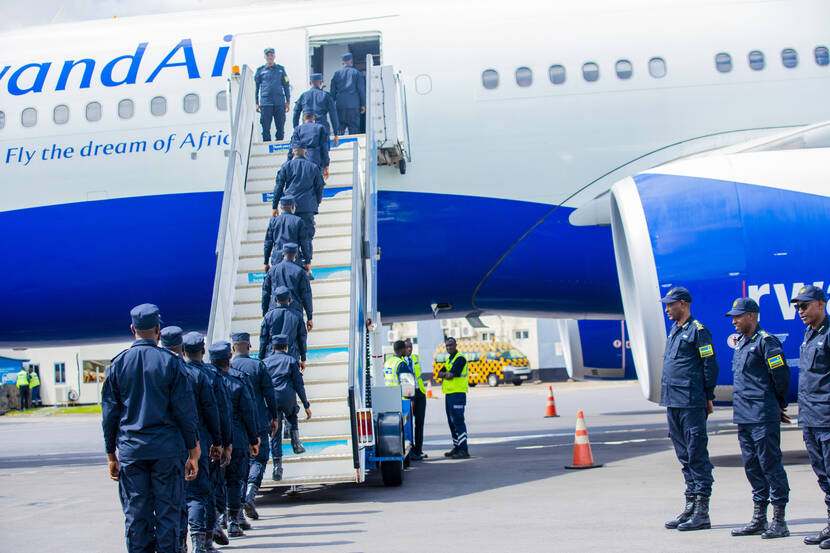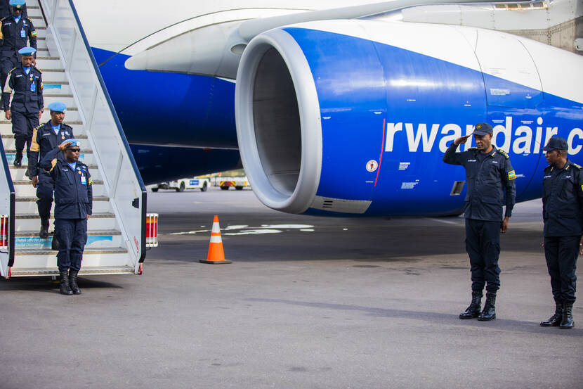 Commissioner of Police (CP) Bruce Munyambo, yabahaye ikaze ubwo bageraga ku kibuga cy'indege Mpuzamahanga cya Kigali ku mugoroba, nyuma yo kwifuriza akazi keza bagenzi babo babasimbuye ubwo bahagurukaga.