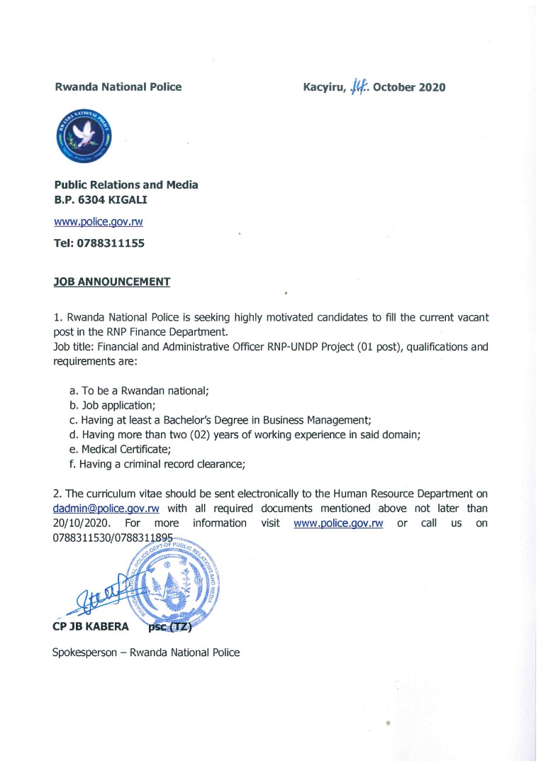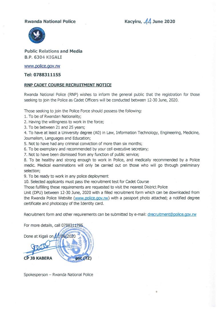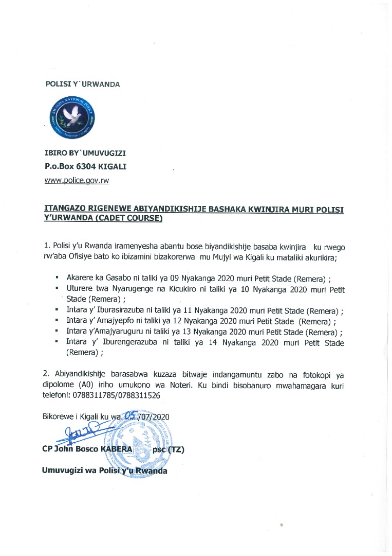 ITANGAZO RIGENEWE ABIYANDIKISHIJE BASHAKA KWINJIRA MURI POLISI Y'URWANDA (CADET COURSE)